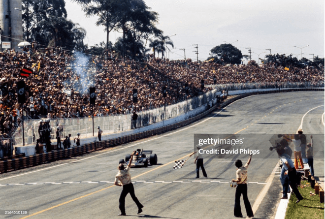 Carlos Pace vence em Interlagos, seguido por Emerson Fittipaldi e Jochen Mass. O resultado consolida o domínio técnico e a trajetória de sucesso dos pilotos brasileiros. (Crédito: David Phipps / Sutton Images)