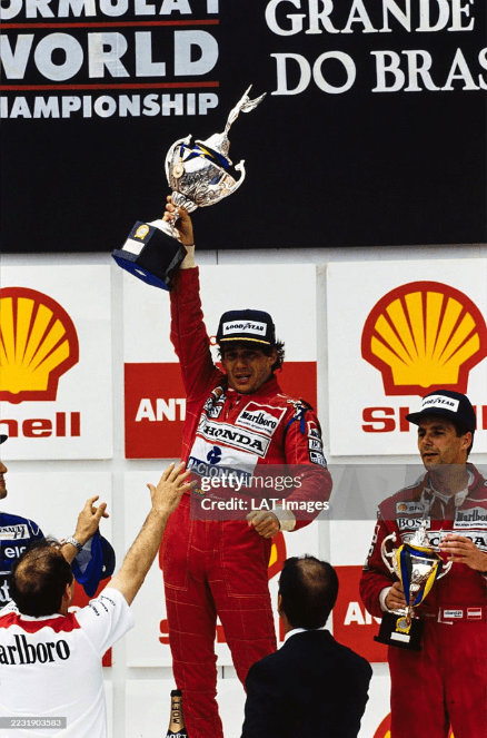 Ayrton Senna vence pela primeira vez diante da torcida brasileira, superando falhas mecânicas e exaustão física. O momento da comemoração com Ron Dennis no pódio tornou-se um símbolo da época. (Crédito: LAT Images)