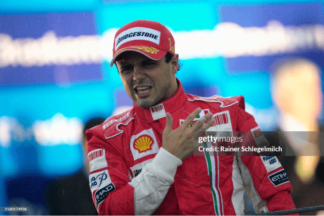 Felipe Massa cruza a linha de chegada como campeão mundial, antes da virada nos segundos finais. A reação do público e das equipes traduz a intensidade do Brasil na Fórmula 1 moderna. (Crédito: Rainer Schlegelmilch / Getty Images)