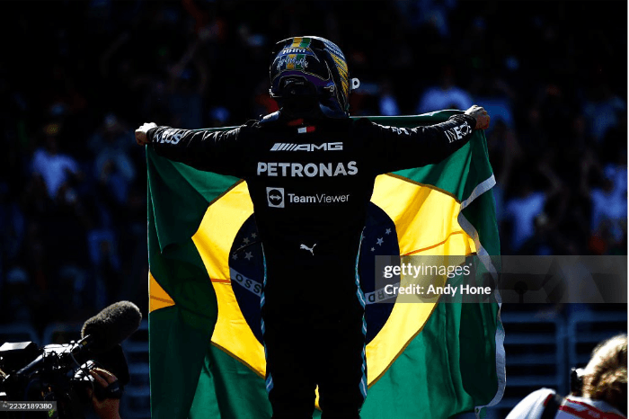Após recuperação histórica, Lewis Hamilton vence em Interlagos e celebra com a bandeira do Brasil, em homenagem a Ayrton Senna e ao público brasileiro. (Crédito: Andy Hone / LAT Images)