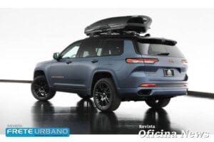 O elegante SUV 4×4 de três fileiras Jeep Grand Cherokee L Breckenridge exibe a carroceria na cor Magnetita fosca/metálica com partes em preto brilhante e detalhes em bronze acetinado. Somando-se ao exterior premium, estão as rodas Mopar de aro 21” e cinco raios, com acabamento preto brilhante. Sobre as barras transversais Mopar foi instalada uma caixa de carga da Thule.