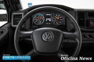Falando do conjunto mecânico, quer dizer, elétrico, o e-Delivery vem equipado com um motor que entrega 300kW e torque máximo de 2.150 Nm desde a rotação zero. A engenhara da VWCO explica que com seis módulos de bateria ou, opcionalmente, três módulos, de acordo com a autonomia necessária à operação.