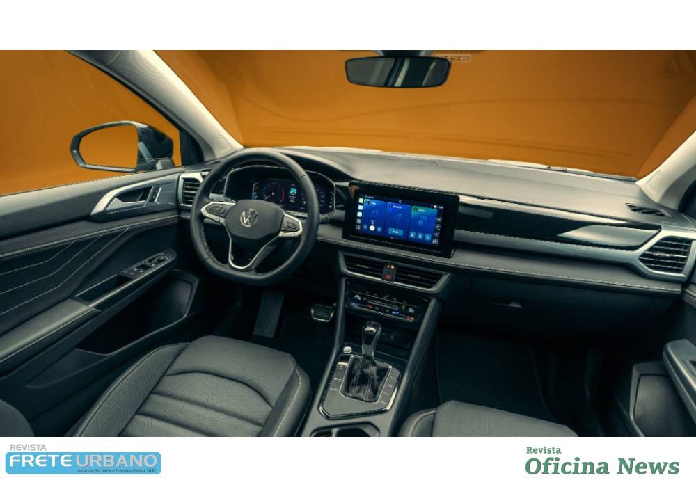 O interior do novo Taos foi revisado com foco em ergonomia e conectividade. O painel ganhou nova construção e acabamento, com revestimentos de textura premium, costuras em contraste e iluminação ambiente configurável em dez cores.